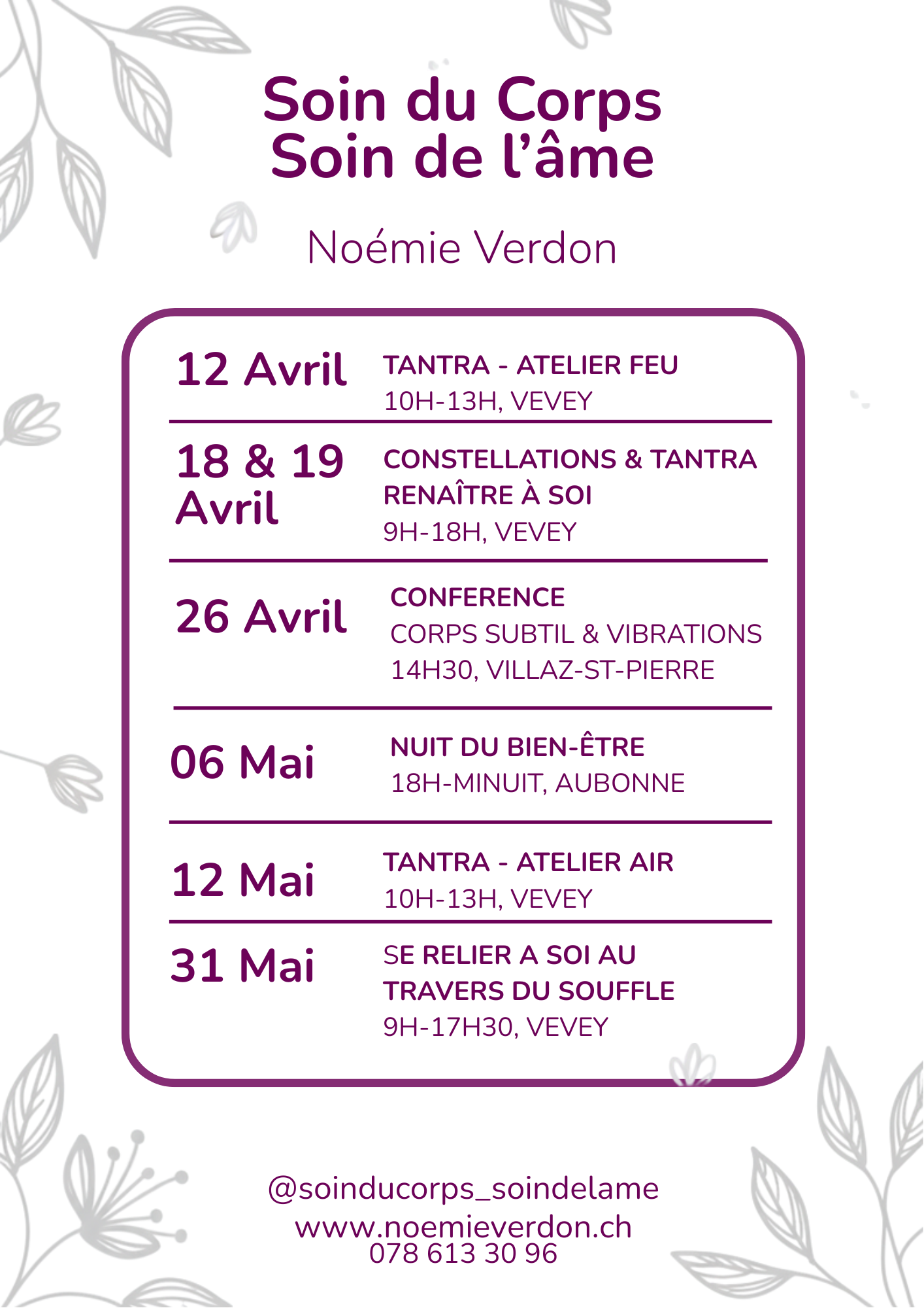 Ateliers dédiés à des thèmes tels que l’ancrage, l’alignement intérieur, la joie, la libération émotionnelle et psychologique, et cours de yoga
